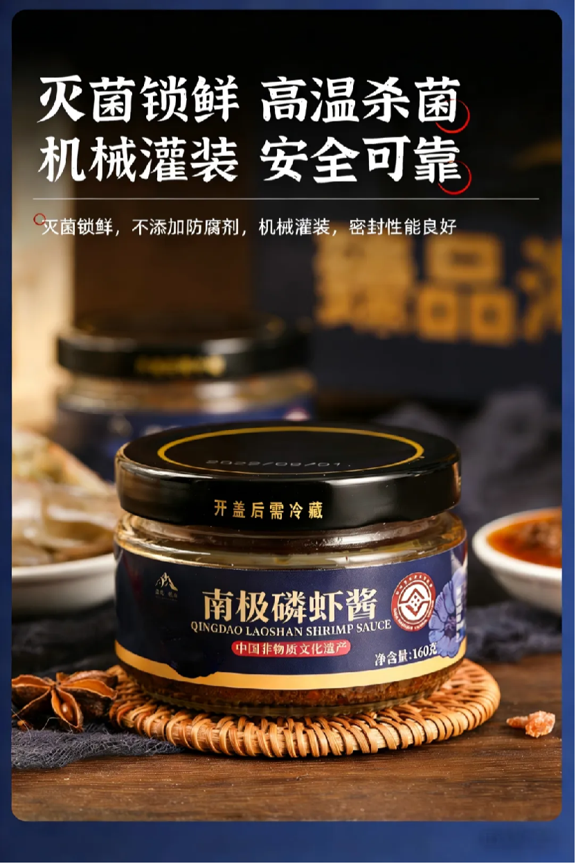 推荐理由:以南极纯净磷虾为核心原料,采用非发酵破壁 + 低温酶解技术,完整保留磷脂型 Omega-3、虾青素、小分子肽等活性营养,0 亚硝酸盐、低钠高鲜,解决传统虾酱腥、咸、不健康痛点。依托青岛海洋产业优势,锁定健康佐餐 + 功能食品双赛道,契合消费升级,市场潜力广阔。
