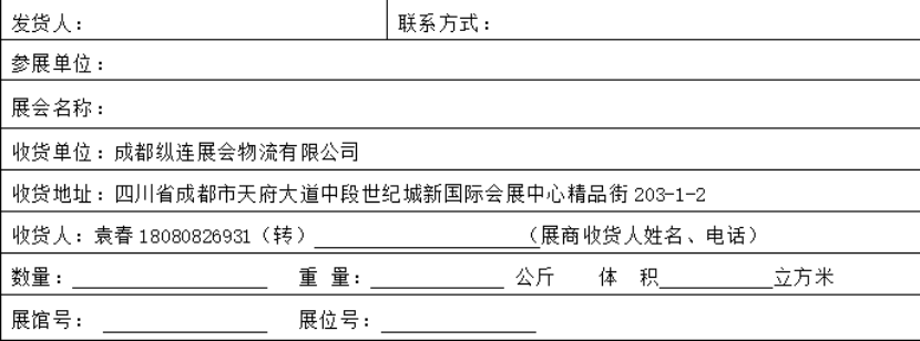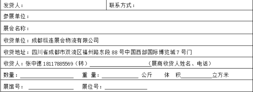 请按以下收货信息自行填写运输单据,并在外包装的醒目位置贴上唛头(特别提醒:唛头一定要写来参展的收货人、电话,否则仓库将不予收货)。相关信息如下: