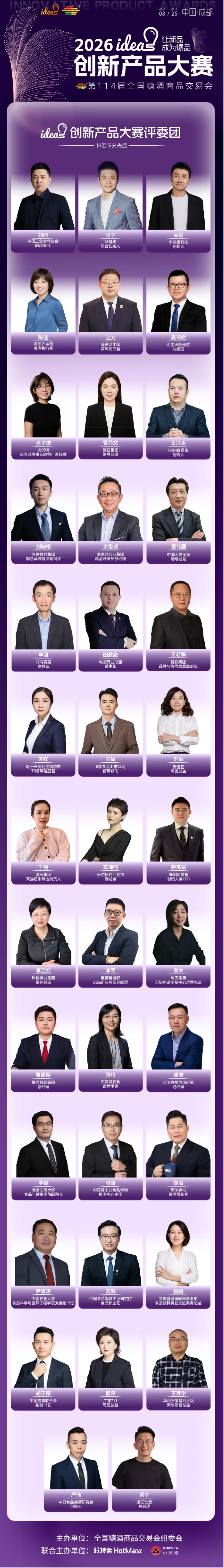 各位评委将以专业视角、严苛标准为大赛评审把关,精准挖掘食品酒饮行业兼具创新价值与市场潜力的优质产品,他们不仅是评委,更是未来爆品的“第一把关人”!