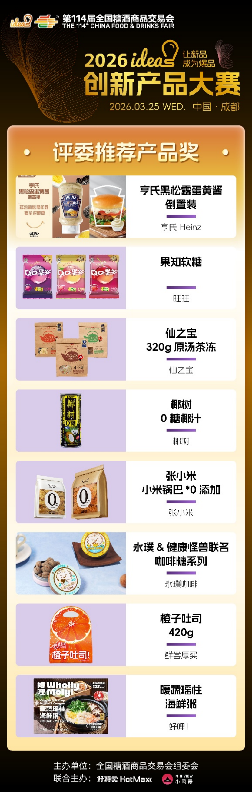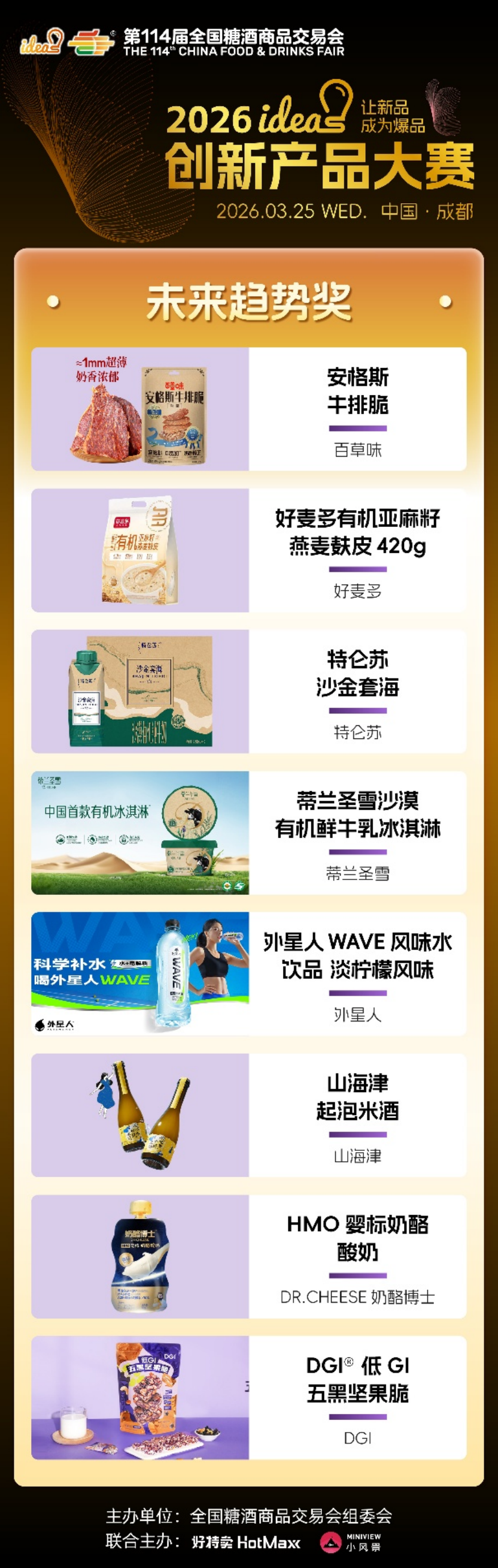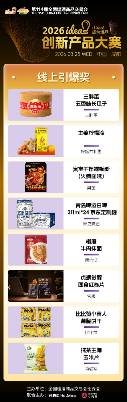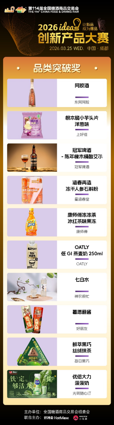ideas创新产品大赛始终以“让新品成为爆品”为核心使命,不仅为优质新品提供高光舞台,更搭建品牌对接、资源互通、市场落地的高效桥梁。96款六大维度奖、五大特殊奖产品,既是创新成果的集中展现,更是未来消费趋势的提前剧透,它们以突破常规的创意、精益求精的品质,打破新品成长壁垒,助力小众创新走向大众爆款,为中国食饮产业注入源源不断的新生动能。