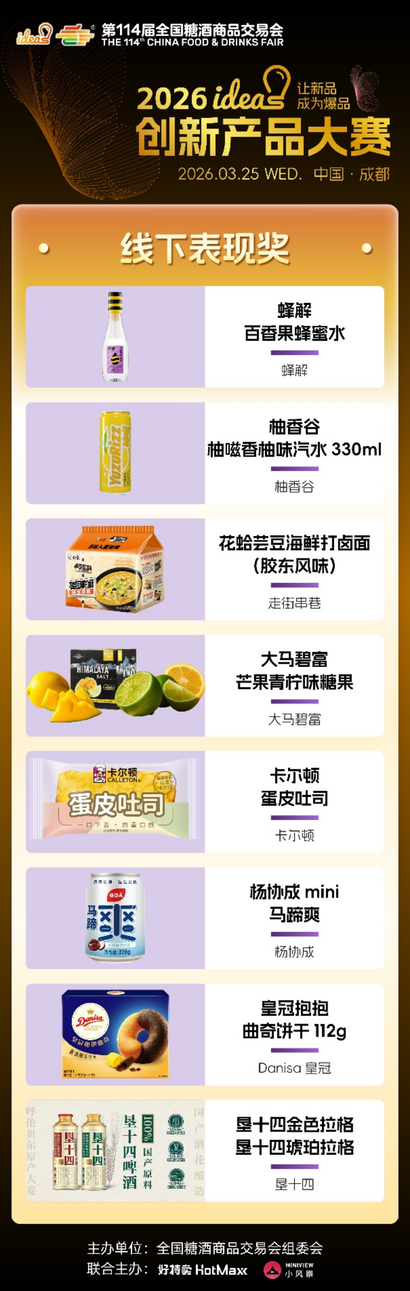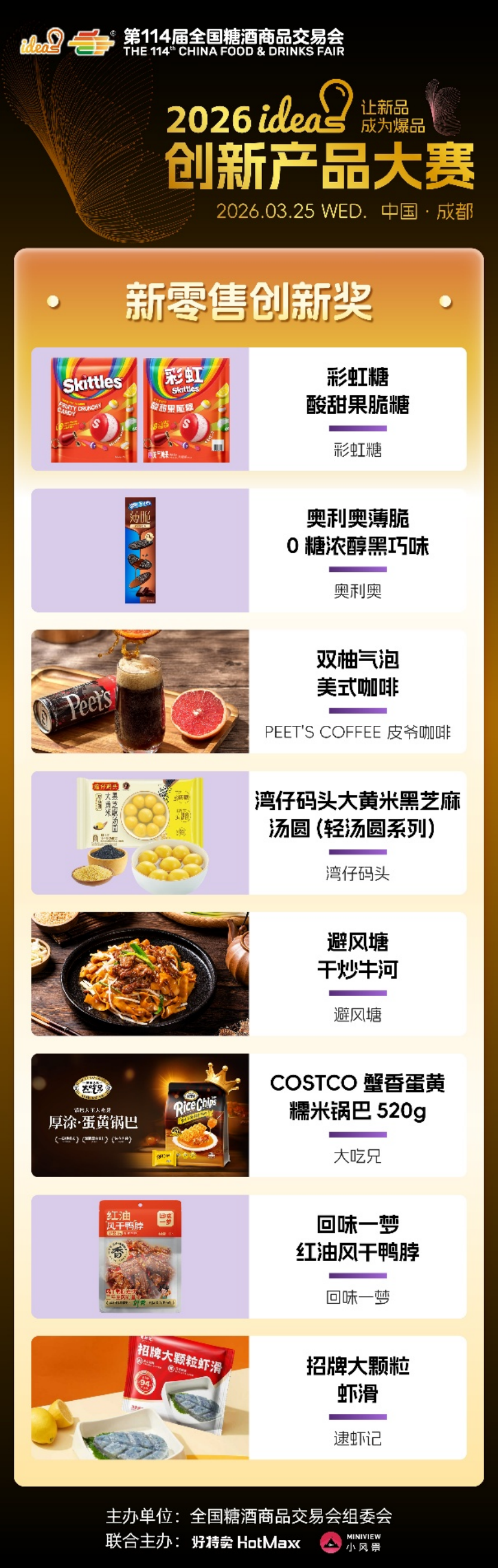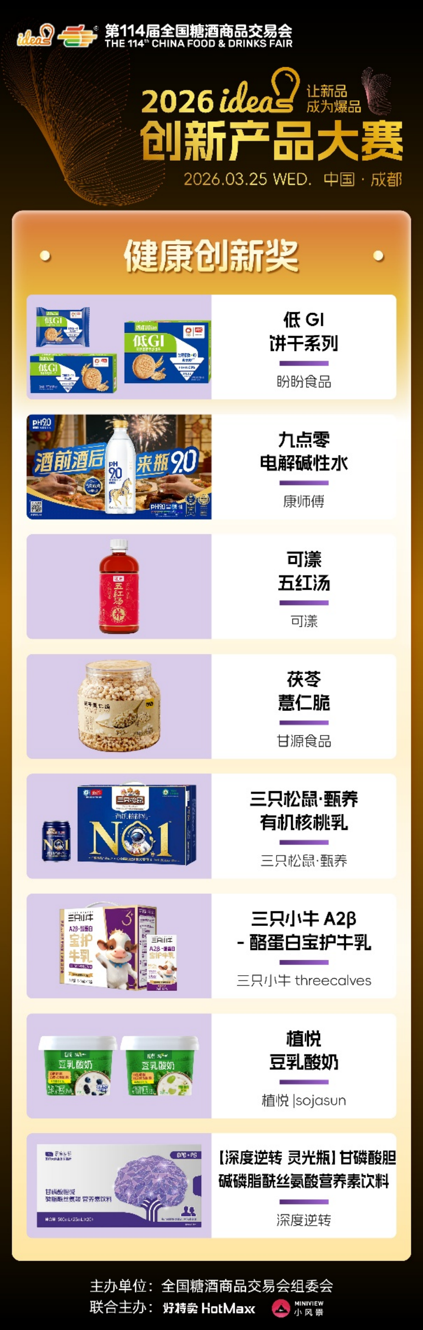 ideas创新产品大赛始终以“让新品成为爆品”为核心使命,不仅为优质新品提供高光舞台,更搭建品牌对接、资源互通、市场落地的高效桥梁。96款六大维度奖、五大特殊奖产品,既是创新成果的集中展现,更是未来消费趋势的提前剧透,它们以突破常规的创意、精益求精的品质,打破新品成长壁垒,助力小众创新走向大众爆款,为中国食饮产业注入源源不断的新生动能。